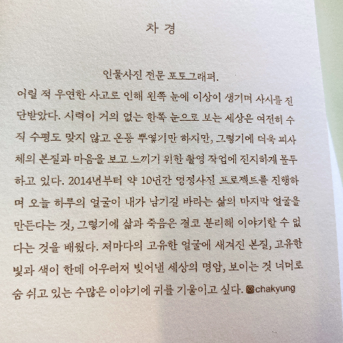 그 사람을 이해하는 데 그가 쓴 책만큼 좋은 자료가 또 있을까? 『볼 수 있는 동안에(책과이음, 2025)』는 그녀가 어떻게 사진작가가 되어 성장해왔는지와 10년간의 영정사진 프로젝트를 기록한 자서전과 같은 책이다.